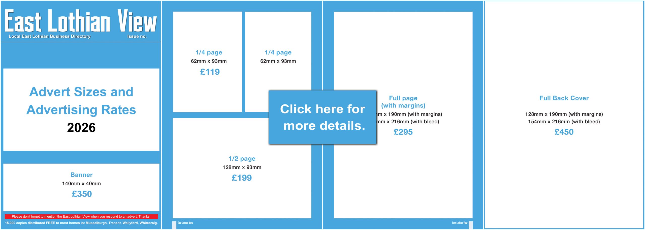 Advertising couldn’t be easier. Just choose the advert size below that suits your needs, then call us on 07791 109252 to secure your required space. If you have your own artwork that’s great, but don’t worry if you haven’t, we can help you with that too. We charge just £20 to have your advert designed to your needs.